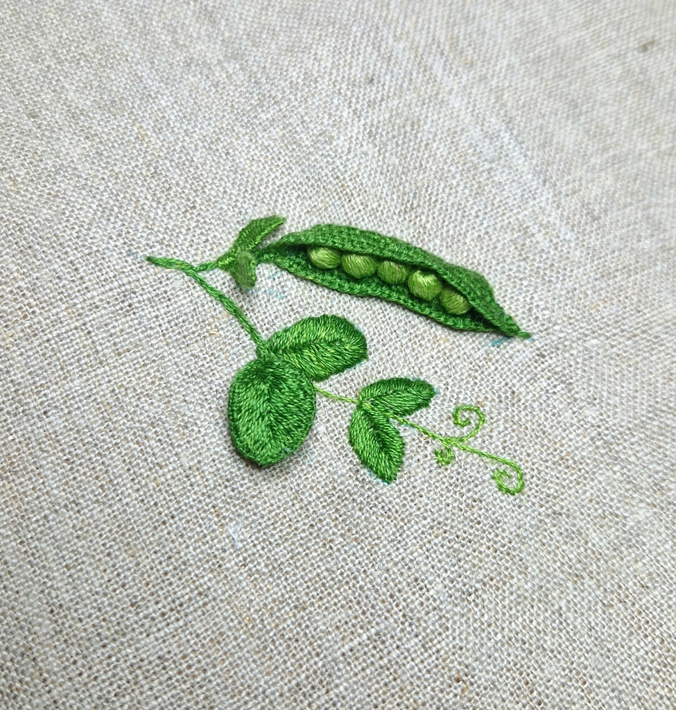 Det er liiige før man både kan dufte, høre og smage de sprøde, grønne ærter, når vi med forskellige teknikker i stumpwork, laver en lille ærtebælg med blade.